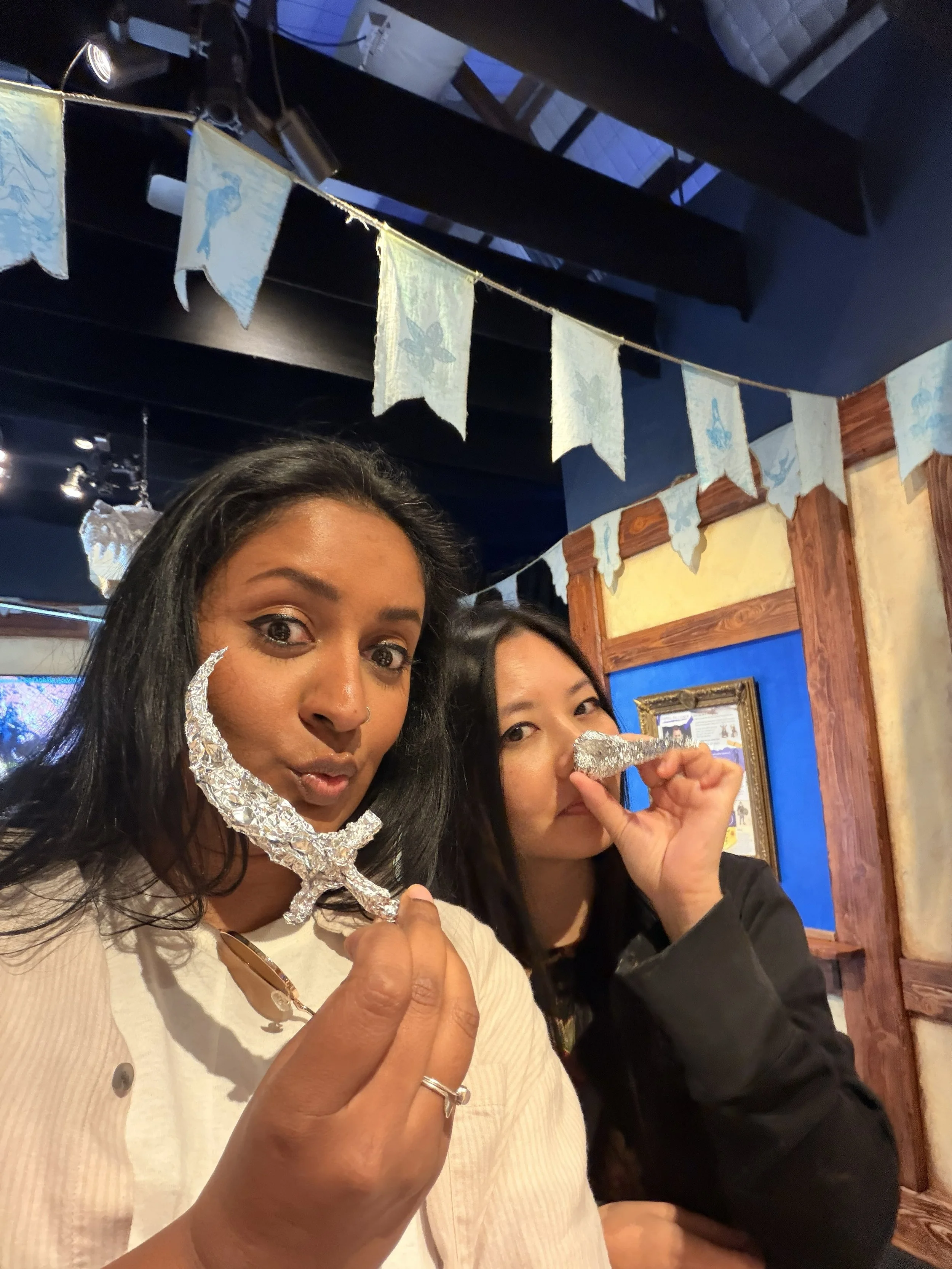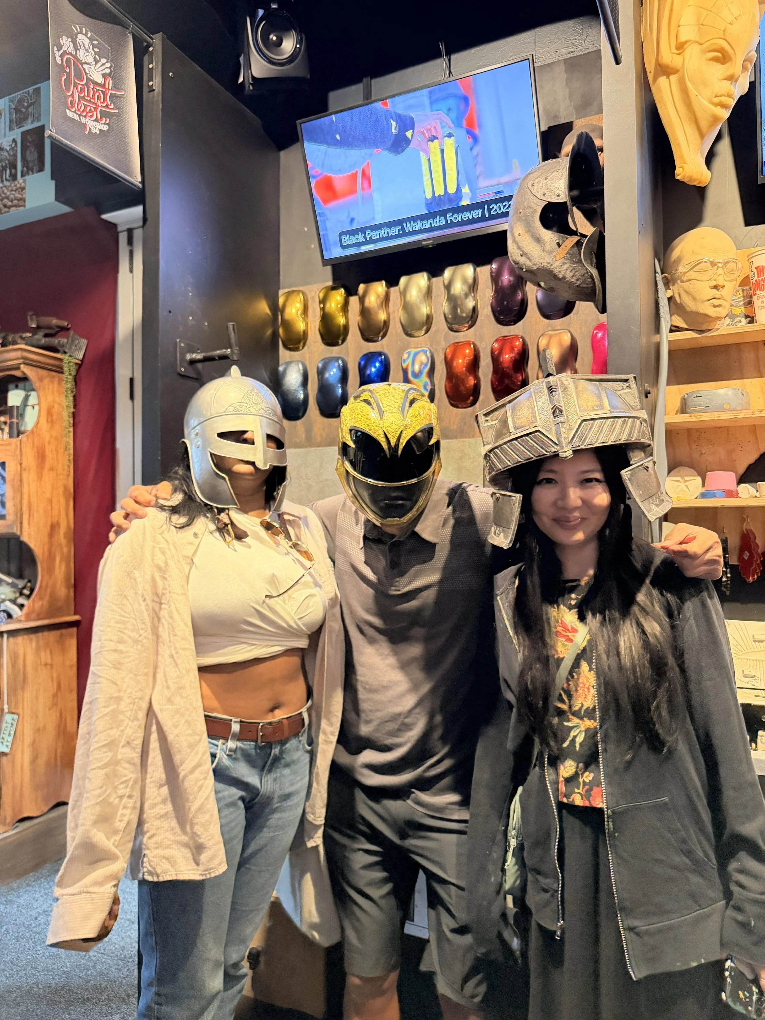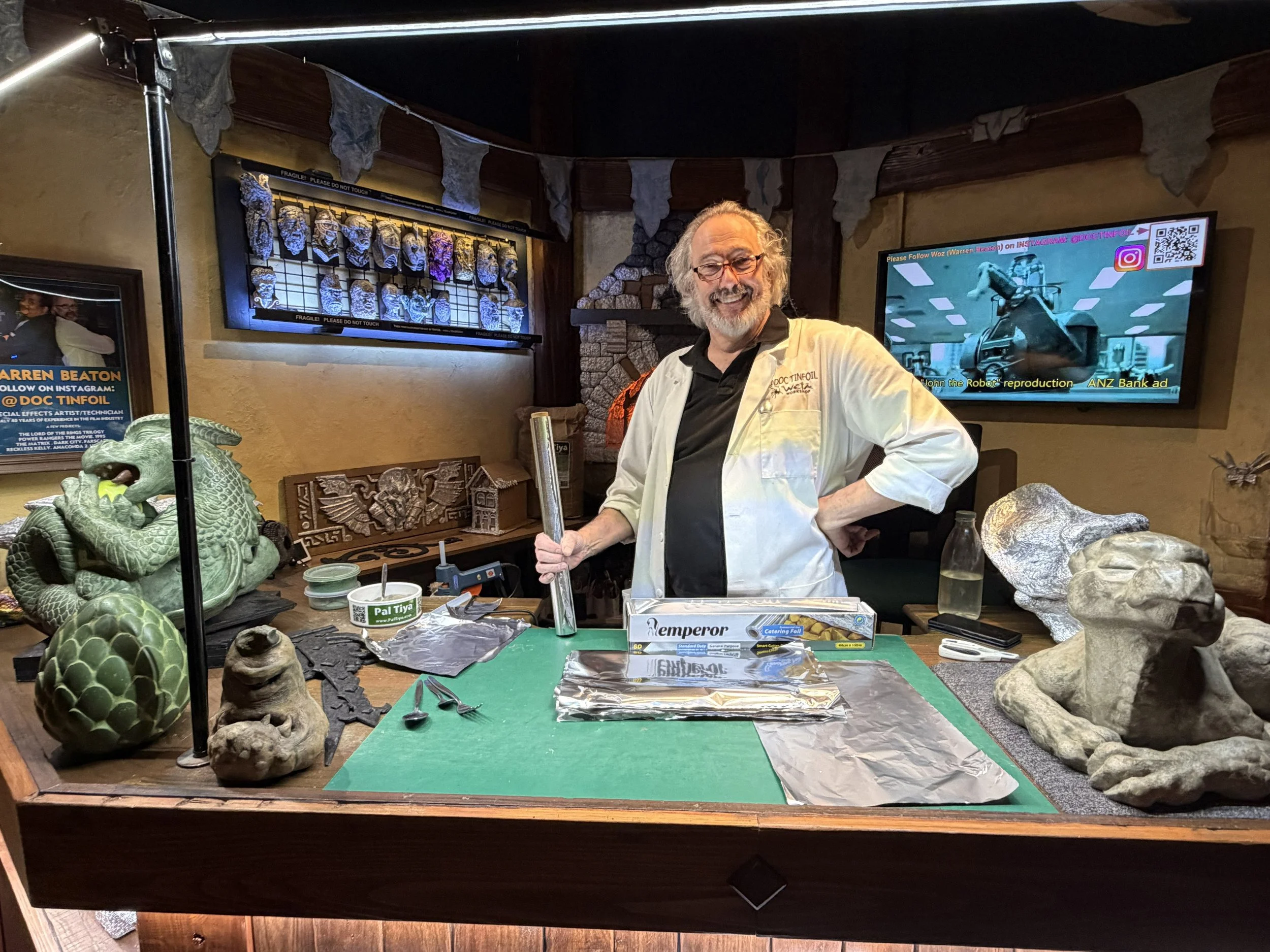 The next room we went into, there was another artist Warren Beaton that was creating Tin Foil Sculptures. It was nothing like I’d ever seen and then they coat it with a substance called Pal Toya which dries like stone, which cuts down the sculpture making by days if not weeks. So cool. Me and Laura made our own little tinfoil creations - Dagger and Plague Doctor.