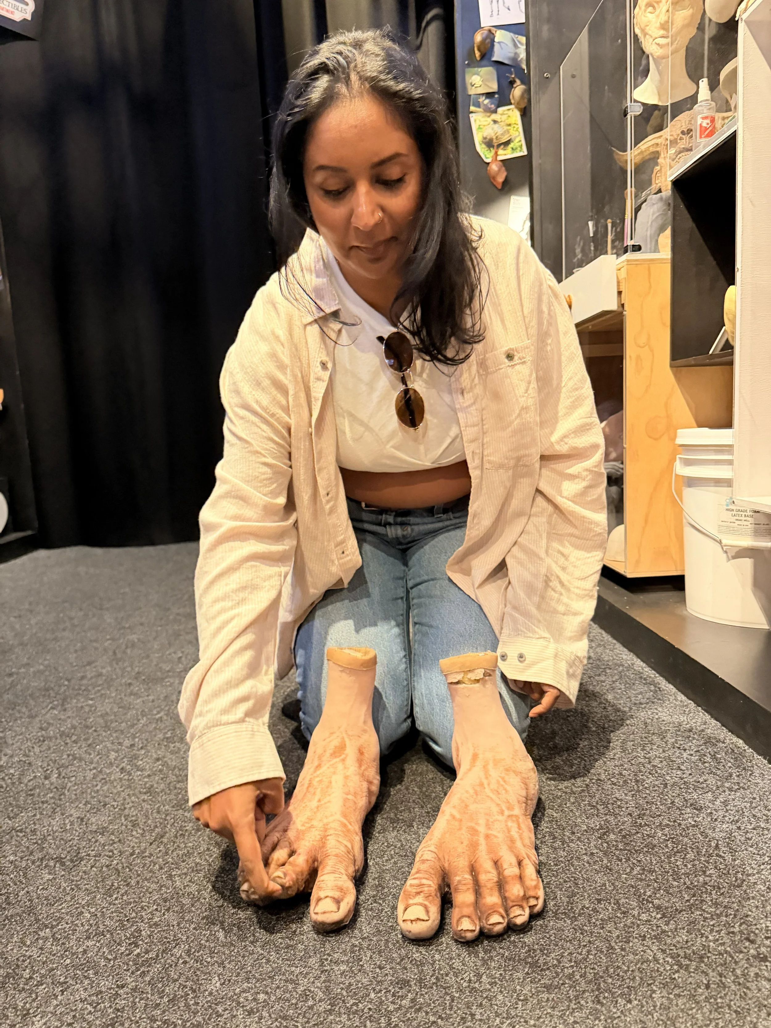 It was really interesting to see the painstaking hours and work that go into make the tiniest prosthetics and they amount of time it then takes to put them on the actors. It was so cool to see the real costumes, and props and life size models of characters I grew up watching on big screen. The first 2 rooms they don’t want you to touch anything and I’m a sensory touch kind of person, but also a rule follower.. this was my personal hell. The props and swords and costumes was starting to call me like a siren song. The temptation to touch and feel the leather in the Riders of Rohan Costumes or the Elven silk and chainmail intertwined into ethereal armour or the life size Sauron costume displayed on a model, the temptation was wild. My fingers would start reaching and hovering around whatever I was looking automatically. It was as though my precious was calling to me. At one point, I couldn’t help myself and I touched Sauron’s armour under the pretense to point something out to Laura.