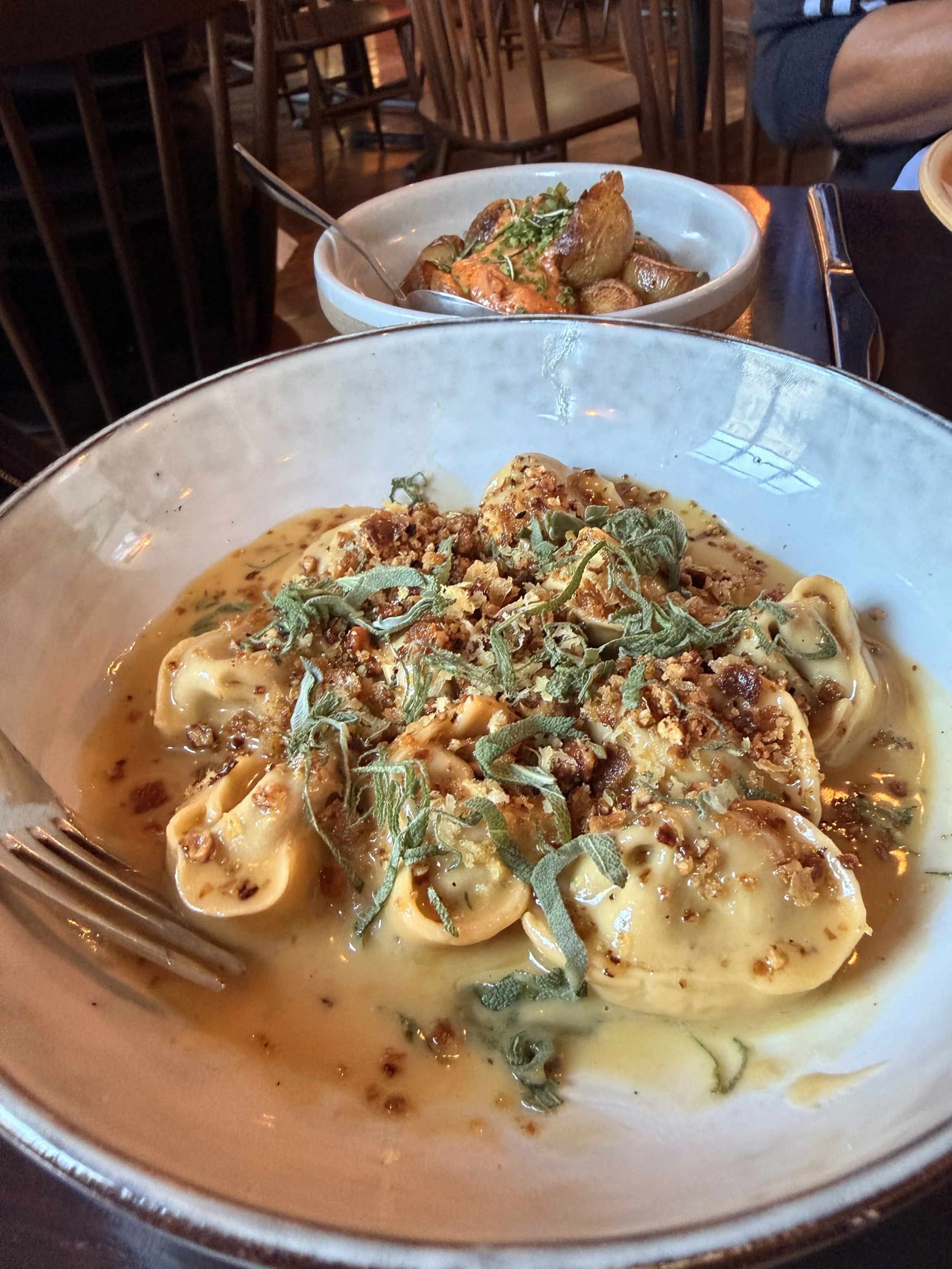 The dinner itself was very good, which we knew it would be judging on how packed this place was. I ordered Fish and Chips with a the Spencer Potato (I know - the chips are also potatoes) on the side. Laura got the Cappeletti (which was basically mushroom tortellini)and the same potatoes. The potatoes were to die for the with their rosemary and garlic butter confit with mascarpone and sundried tomato. chefs kiss