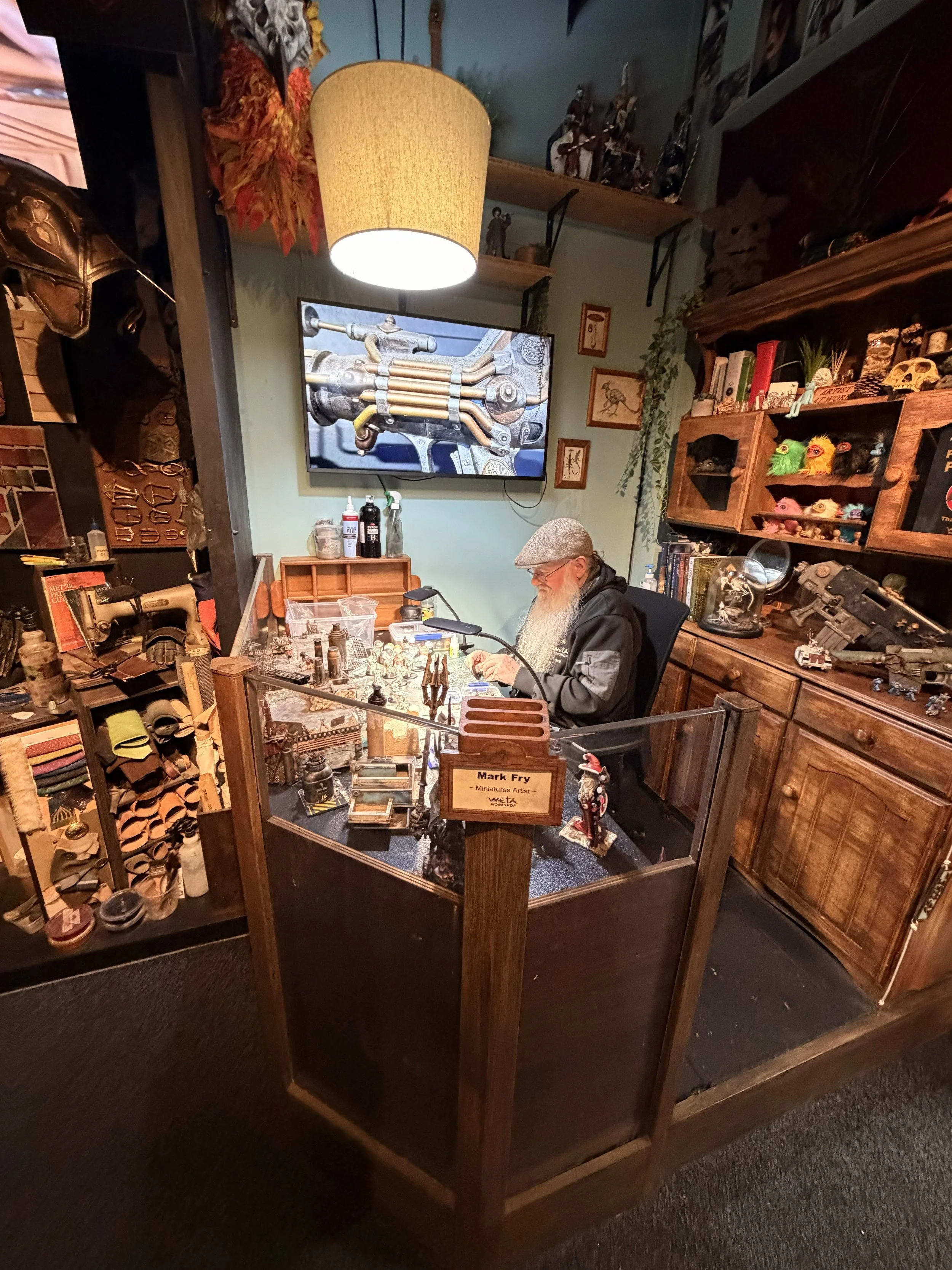 Finally in the 3rd room we got to meet Mark Fry, he was the Weta Miniatures artist. He was in his little workshop just working on miniatures that are eventually sold in the Weta Giftshop and educated us on the importance of keep the art of crafting alive. You could tell he loved what he did and even made a joke that he wants to die there and that when he’s dead they can just sweep out his ashes from under the desk. Morbid, so naturally we were delighted by that comment. I was here we got to play with some of the props and I genuinely felt excited.